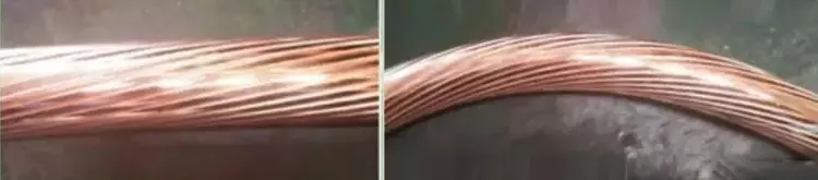 彎曲對(duì)導(dǎo)體的影響:電纜導(dǎo)體由多根單芯導(dǎo)線以一定節(jié)距絞合而成,在導(dǎo)體制作過程中導(dǎo)體的單線根數(shù)和節(jié)距大小決定了導(dǎo)體彎曲時(shí)的穩(wěn)定性,過大的彎曲將導(dǎo)致導(dǎo)體的松散和突起,直接影響導(dǎo)體外層半導(dǎo)電層和絕緣層的性能。