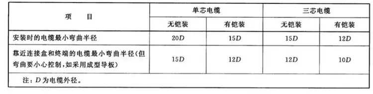 根據(jù)GB 50054-95低壓配電設(shè)計(jì)規(guī)范中第5.6.39條,電纜敷設(shè)的彎曲半徑與電纜外徑的比值,不應(yīng)小于表3的規(guī)定。