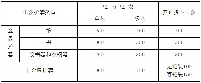 無鎧裝電纜,應(yīng)不低于電纜外徑的6D;鎧裝或銅帶屏蔽電纜,應(yīng)不低于電纜外徑的12D;屏蔽軟電纜,就不低于電纜外徑的6D。