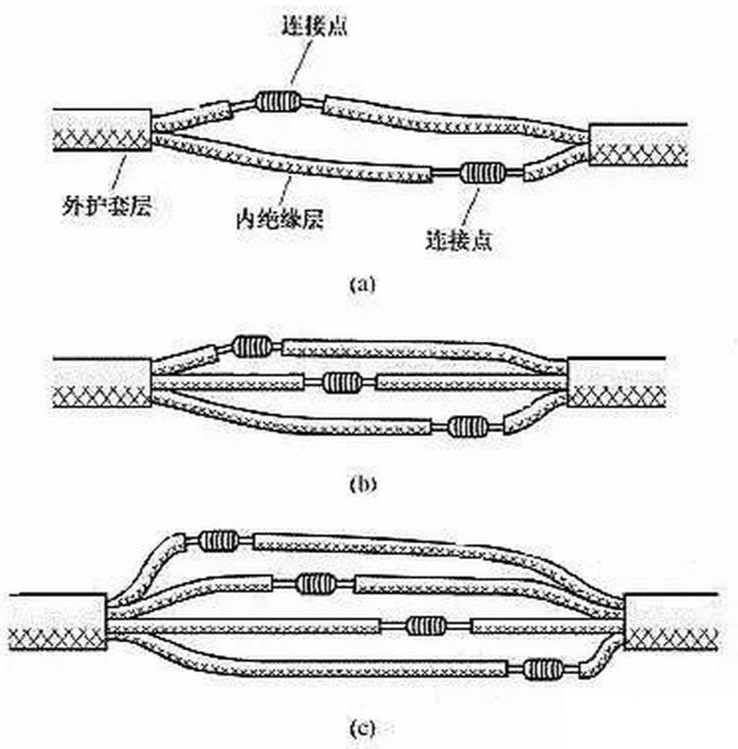 (7)雙芯或多芯電線電纜的連接。雙芯護(hù)套線、三芯護(hù)套線或電纜、多芯電纜在連接時,應(yīng)注意盡可能將各芯線的連接點(diǎn)互相錯開位置,可以更好地防止線間漏電或短路。圖11(a)所示為雙芯護(hù)套線的連接情況,圖 11(b)所示為三芯護(hù)套線的連接情況,圖11(c)所示為四芯電力電纜的連接情況。
