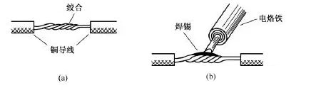 (1)銅導(dǎo)線接頭的錫焊。較細(xì)的銅導(dǎo)線接頭可用大功率(例如150W)電烙鐵進(jìn)行焊接。焊接前應(yīng)先清除銅芯線接頭部位的氧化層和黏污物。為增加連接可靠性和機(jī)械強(qiáng)度,可將待連接的兩根芯線先行絞合,再涂上無酸助焊劑,用電烙鐵蘸焊錫進(jìn)行焊接即可,如圖17所示。焊接中應(yīng)使焊錫充分熔融滲入導(dǎo)線接頭縫隙中,焊接完成的接點(diǎn)應(yīng)牢固光滑。